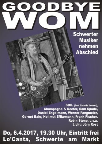 Good night Irene sang Frank FraJüFi Fischer, an der Gitarre begleitet von Robin Stone und Hellmut Efkemann. Damenbesuch gab's auch. Kerstin Schneider, Monika Ohm und Susan Kent (die übrigens im September mit einer elfköpfigen Band das Pannekaukenfest rocken wird) sangen You've got a friend von Carole King. Schließlich trat noch die Champagne & Reefer Blues Band auf; auch in dieser Band hat Wom gespielt. Am Donnerstag war er im Geiste dabei. Seinen Platz in den Annalen der Schwerter Musikszene hat er gefunden.